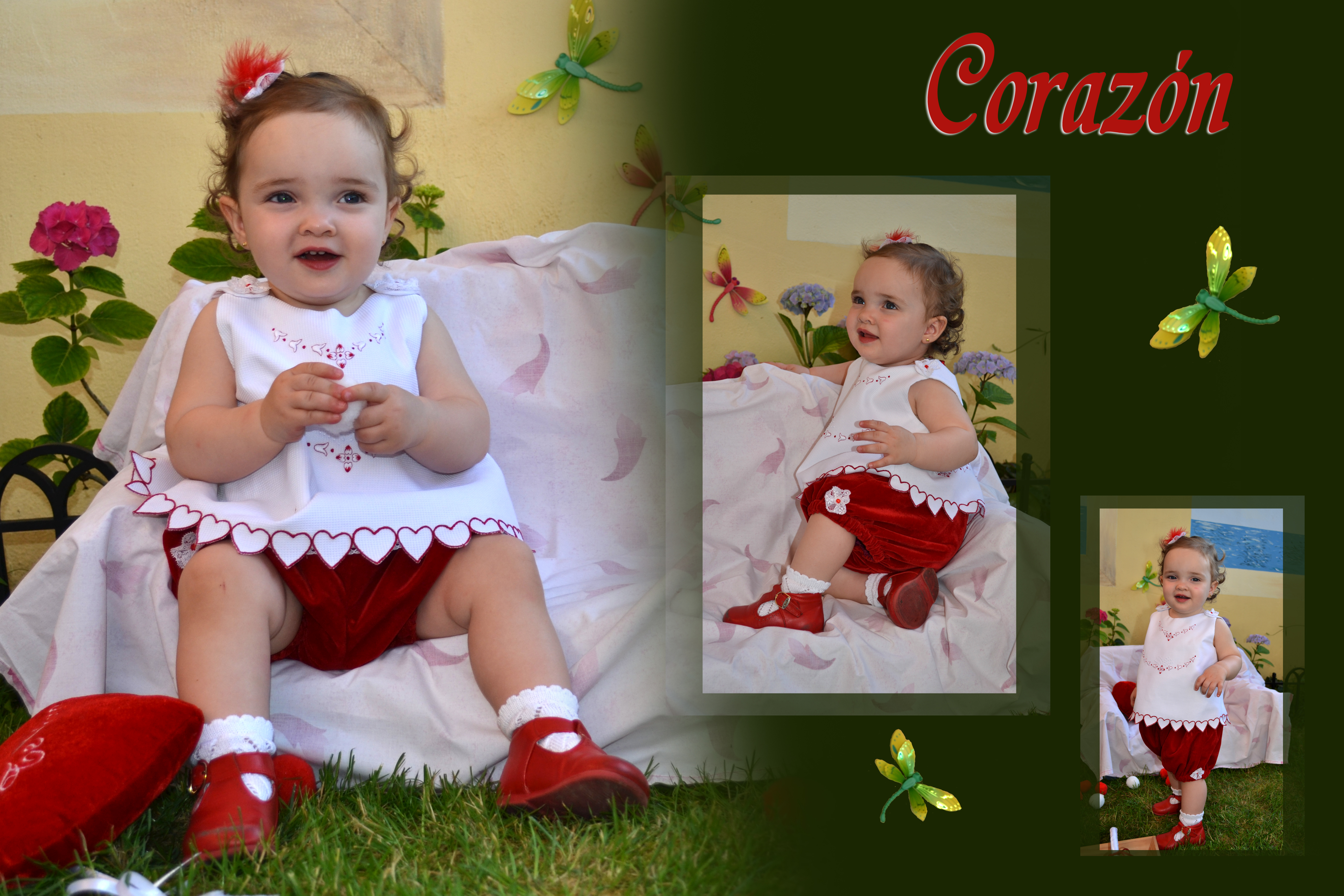 Para completar este precioso diseño, he confeccionado un pequeño tocado para el pelo; formando una roseta de encaje valencié como las anteriores pero un poco mas grande, plumas naturales en rojo y un detalle de pedrería en los mismos tonos. Este es un detalle que complementa este vistoso trajecito, una prenda muy cómoda para bebés de 15 meses a 3 añitos, ¡quedan monísimos! l@s niñ@s en este etapa, se mueven mucho, de pié, sentad@, de rodillas…