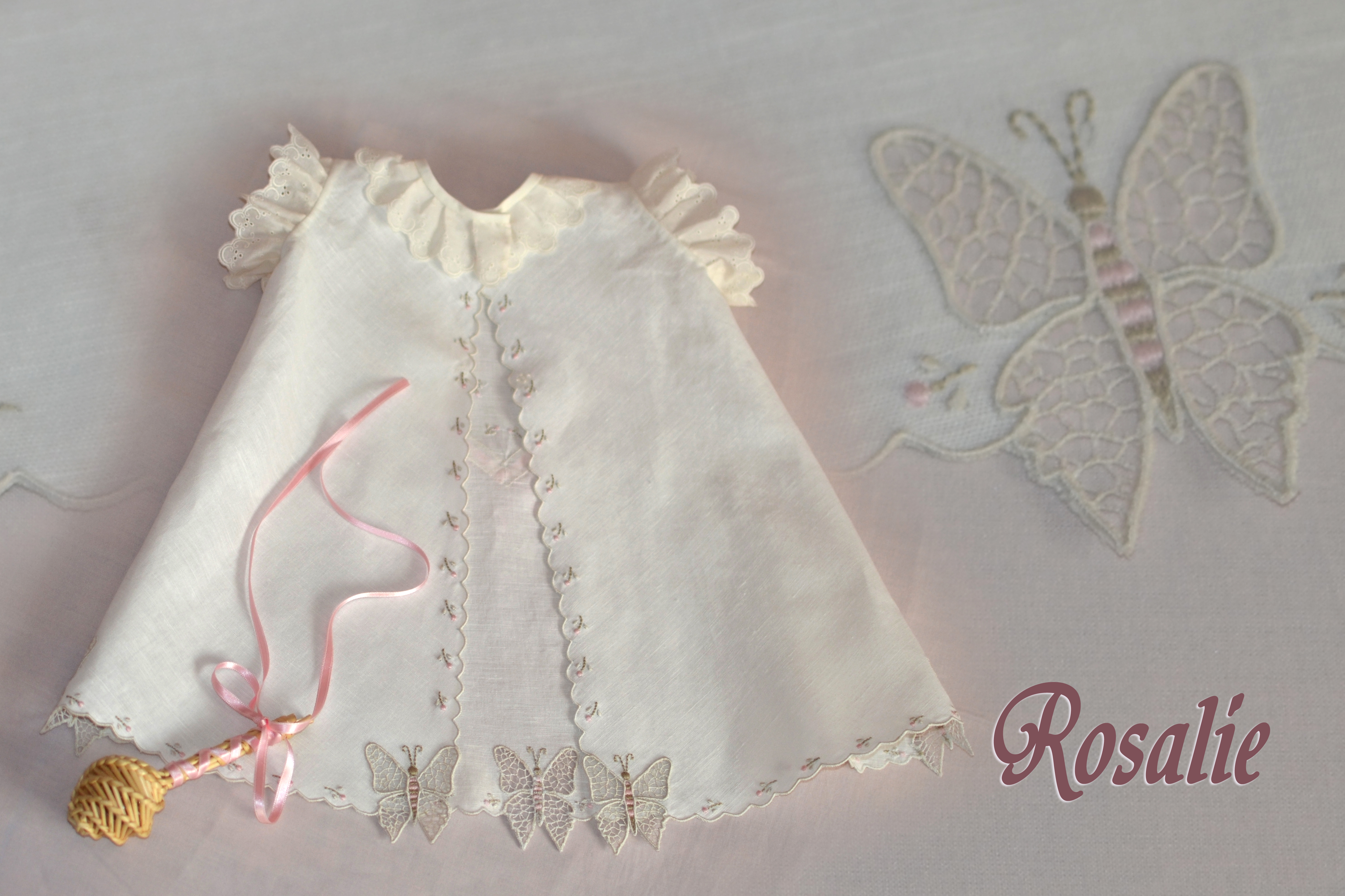 El diseño de bordado para este modelo es difícil de realizar por las mariposas en punto de bruja, un trabajo en abierto para después tejer ese calado similar a (Richelieu) pero con mas trabajo. Como podéis apreciar las cuatro alas de cada mariposa están realizadas de la misma forma. Cuando cada parte está pespunteada y preparada, se comienza a recortar en pequeñas porciones, tejiendo ese calado, cuando cada parte está completada se ribetea con realce fino. Lo más complicado es realizar la parte inferior donde las alitas quedan al aire, sin ninguna sujeción al tejido.